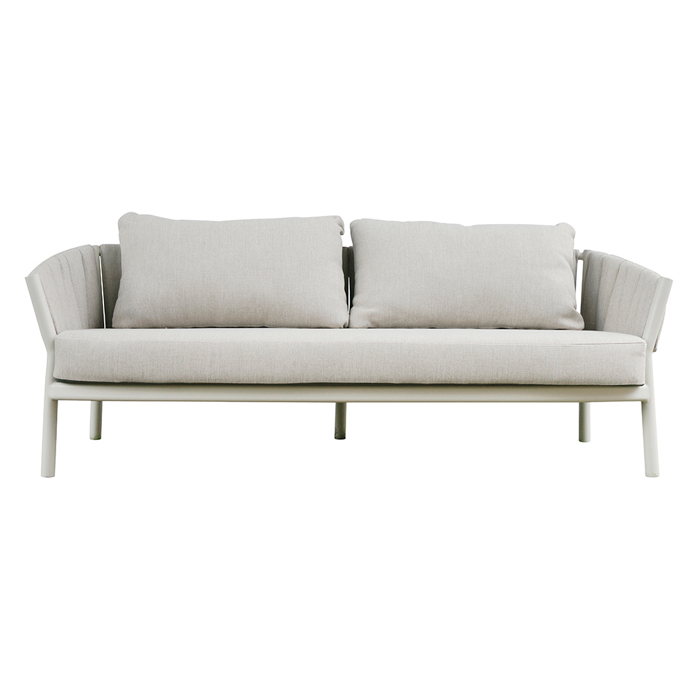 1 Sofa: weißer Aluminiumrahmen, Aluminiumrücken und -arme mit grauer Polsterung, graue abnehmbare Stoffkissen.