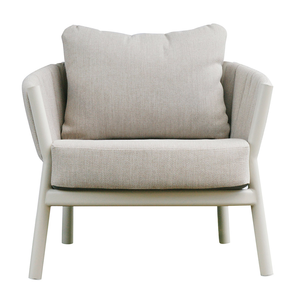 2 Sessel: weißer Aluminiumrahmen, Aluminiumrücken und -armlehnen mit grauer Polsterung, Kissen mit abnehmbaren grauen Stoffbezügen.