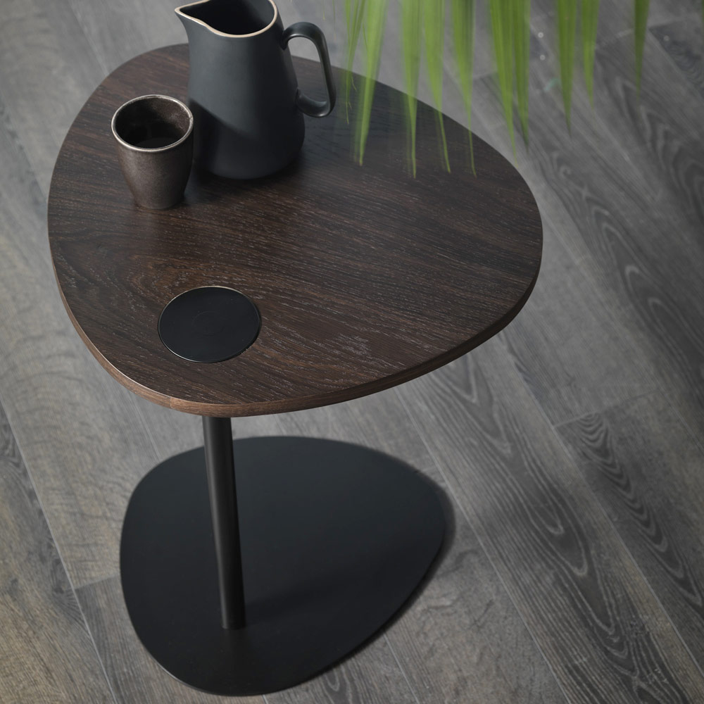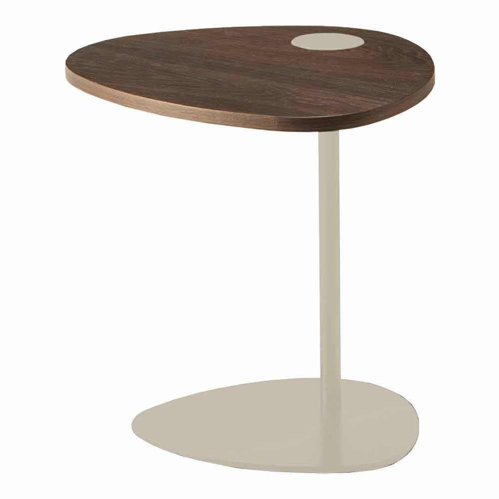 Das originelle und elegante Design besteht aus verschiedenen Materialien, die jedoch in harmonischer Leichtigkeit miteinander kommunizieren: Das dünne, aber widerstandsfähige Metall der Struktur stützt die geräucherte Eichenholzplatte.