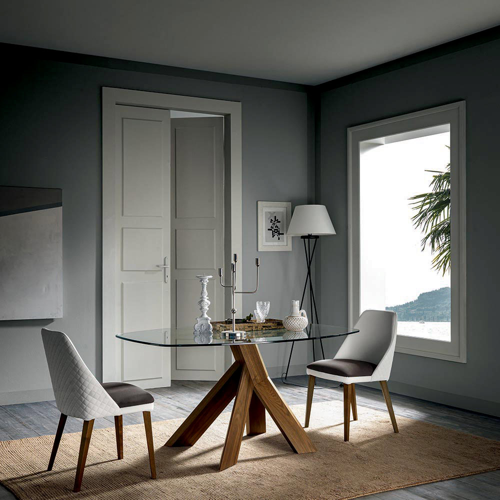 Esstisch aus Glas und Beinen aus furniertem Holz made in Italy.