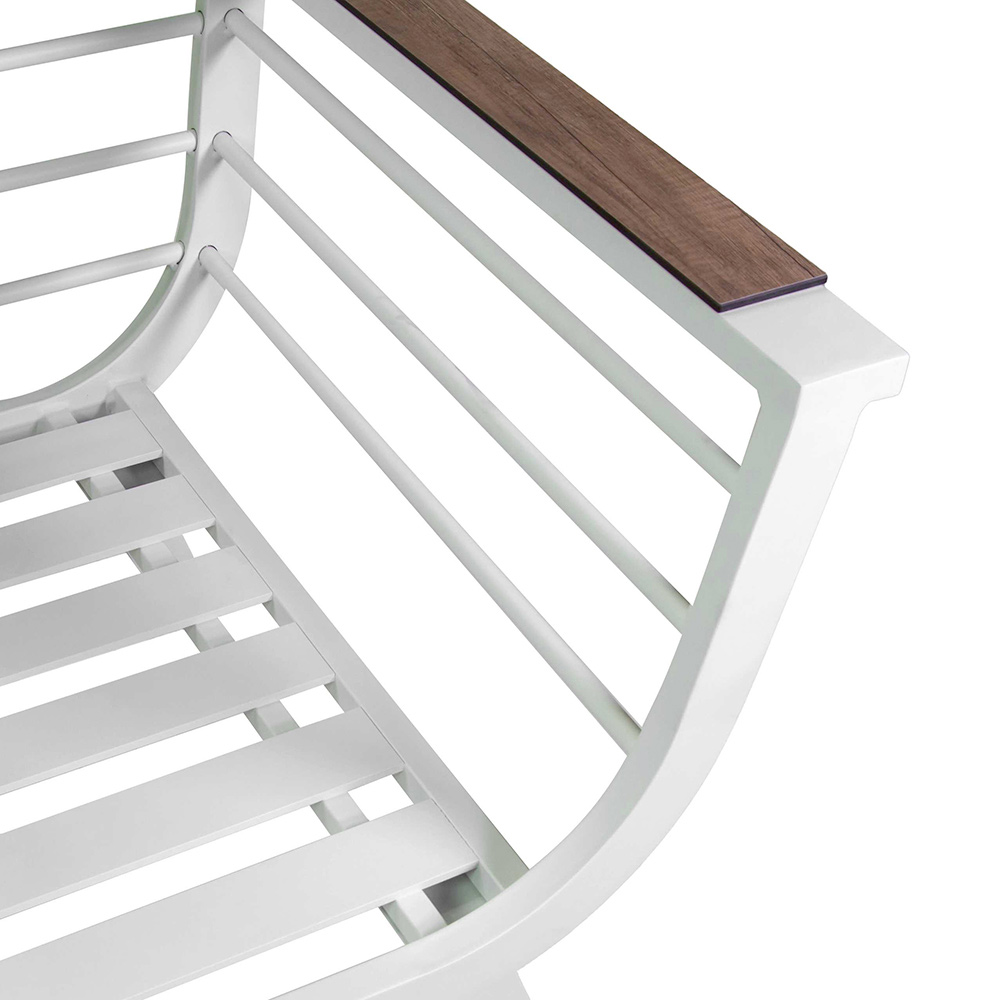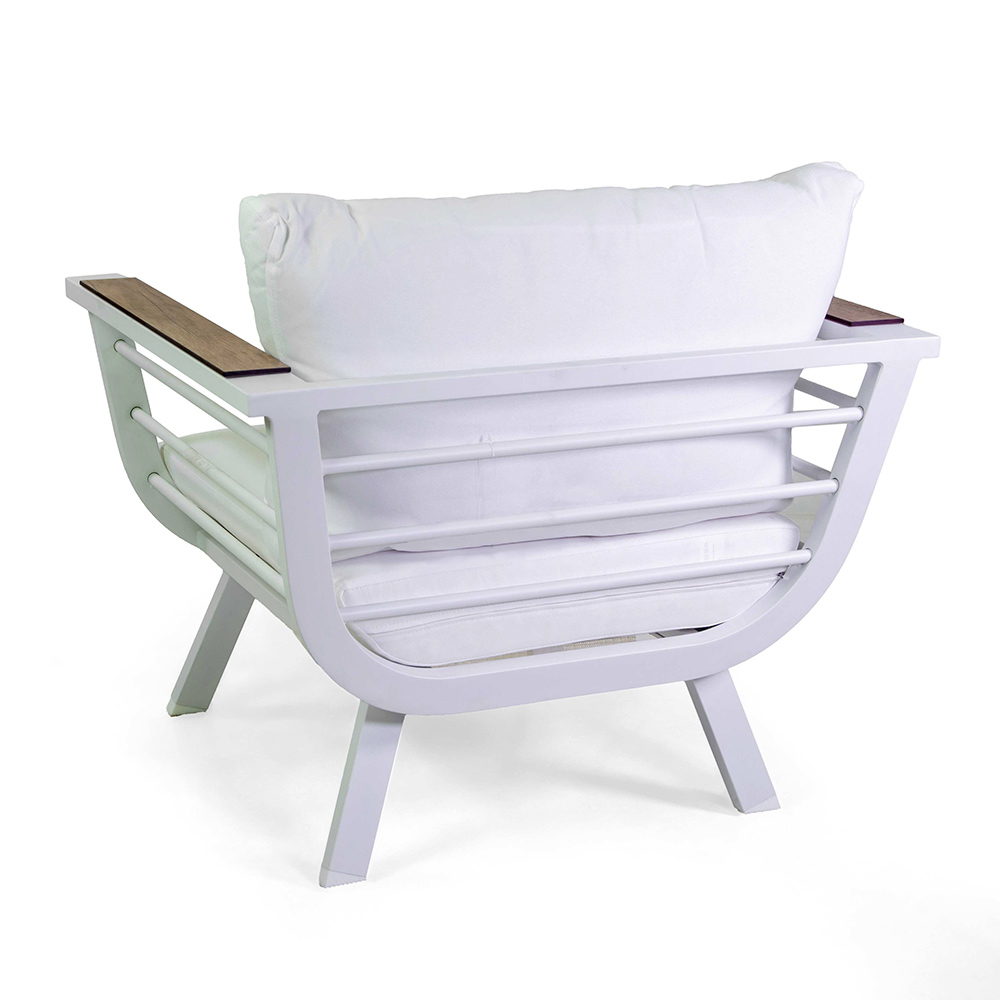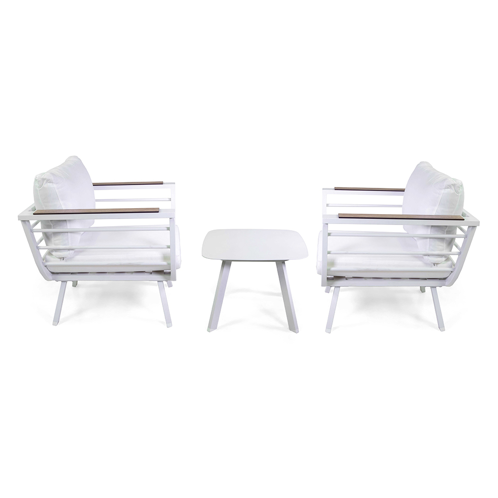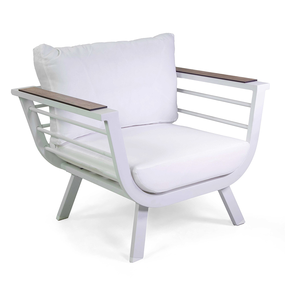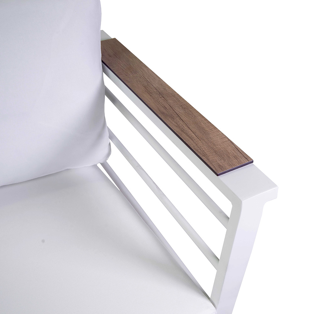 Entdecke moderne Eleganz und Komfort mit diesem weißen pulverbeschichteten Aluminium Lounge Set . Perfekt, um Ihrem Außenbereich einen Hauch von Klasse zu verleihen, umfasst dieses Set zwei Sessel mit 12 cm dicken abnehmbaren Kissen aus 100% wasserabweisendem Olifen-Stoff, die Komfort und Langlebigkeit garantieren. Die HPL-Armlehneneinsätze verleihen einen Hauch von Stil und Zweckmäßigkeit, während der weiße Aluminiumtisch robust und pflegeleicht ist.