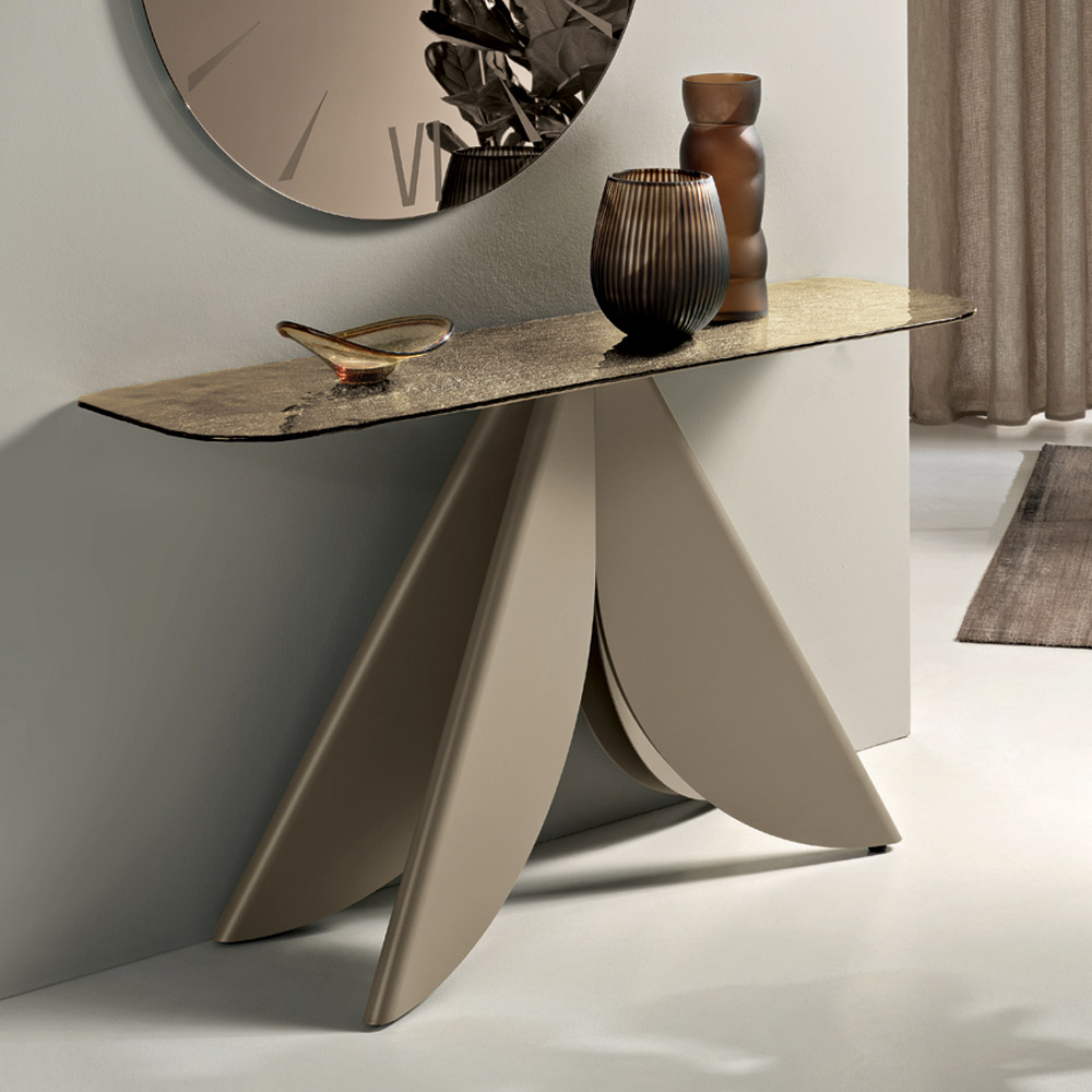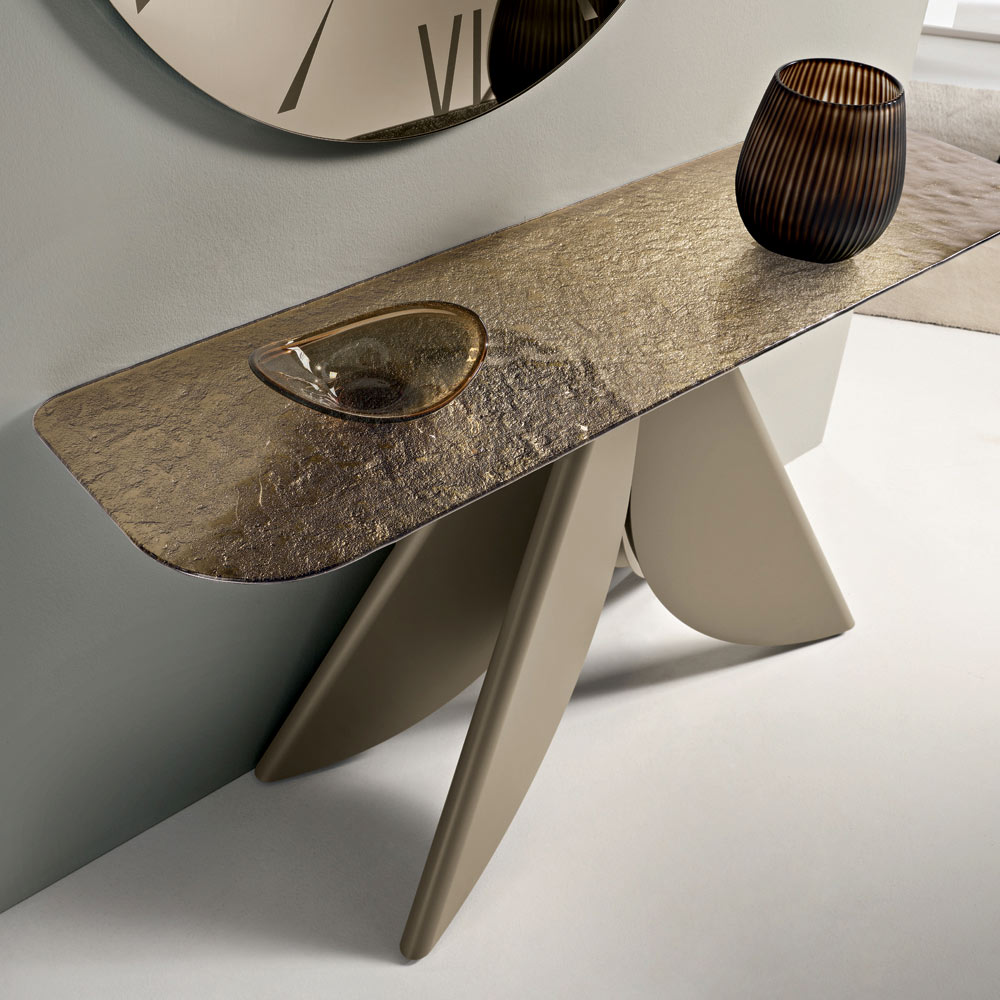 Wohnzimmer-Konsolentisch aus Metall mit rückseitig silberfarbener, gehämmerten Glasplatte - Cristiana