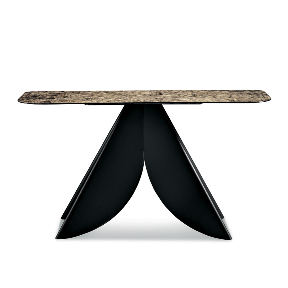 Charakteristisch für die Struktur ist ein lackierter Metallsockel, der aus vier ineinander verschlungenen, gebogenen Elementen besteht, die an die Form von Blütenblättern erinnern und so einen raffinierten, dynamischen und szenografischen grafischen Effekt erzeugen.