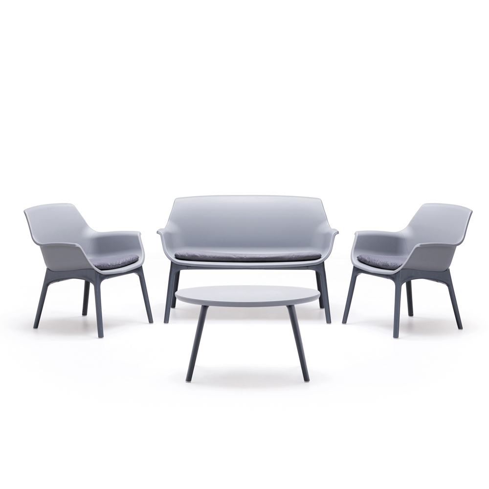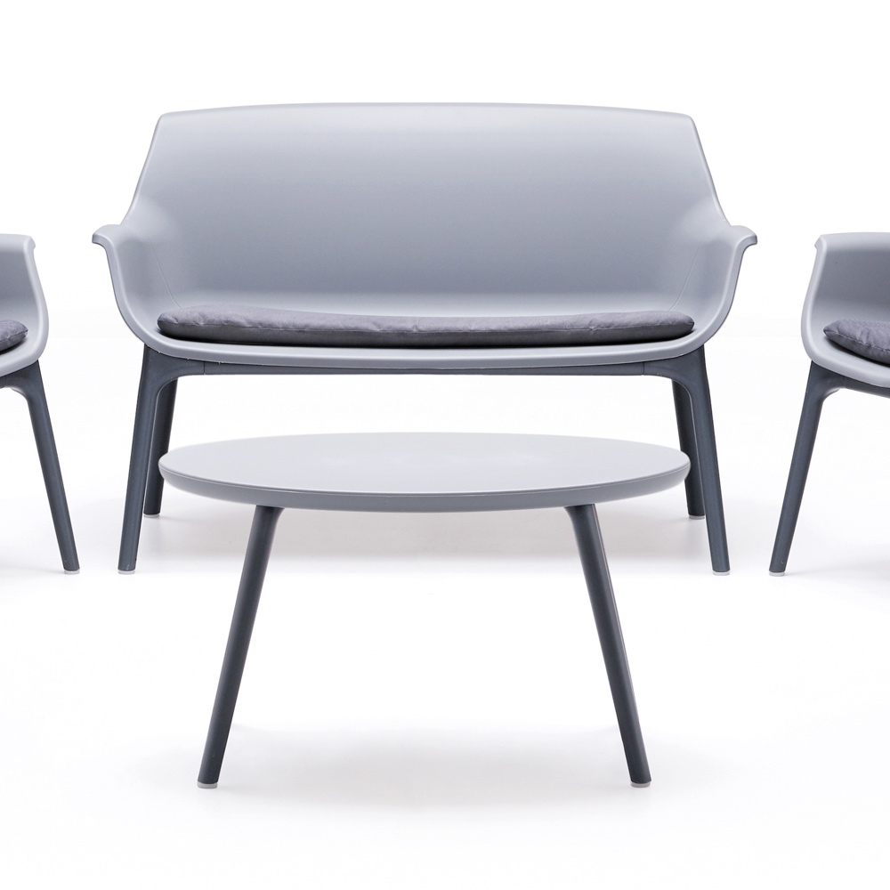 Der zentrale Tisch , ebenfalls aus Polypropylen, eignet sich perfekt für Getränke, Bücher oder ein elegantes Blumenarrangement. Die neutrale Farbpalette und die raffinierte Textur passen sich harmonisch jeder Außenumgebung an, vom modernen Garten bis zur städtischen Terrasse.