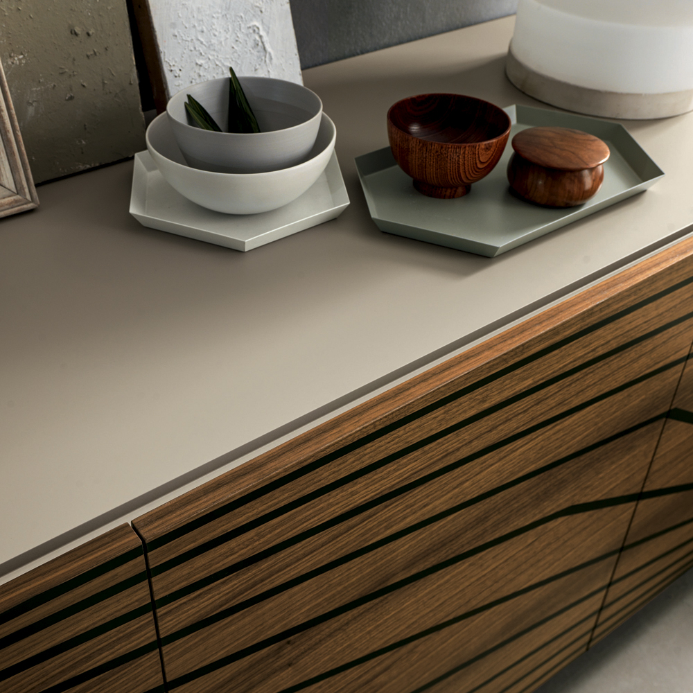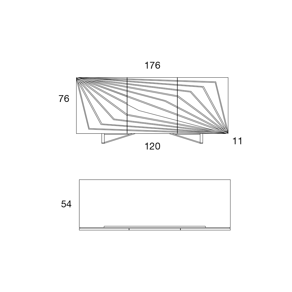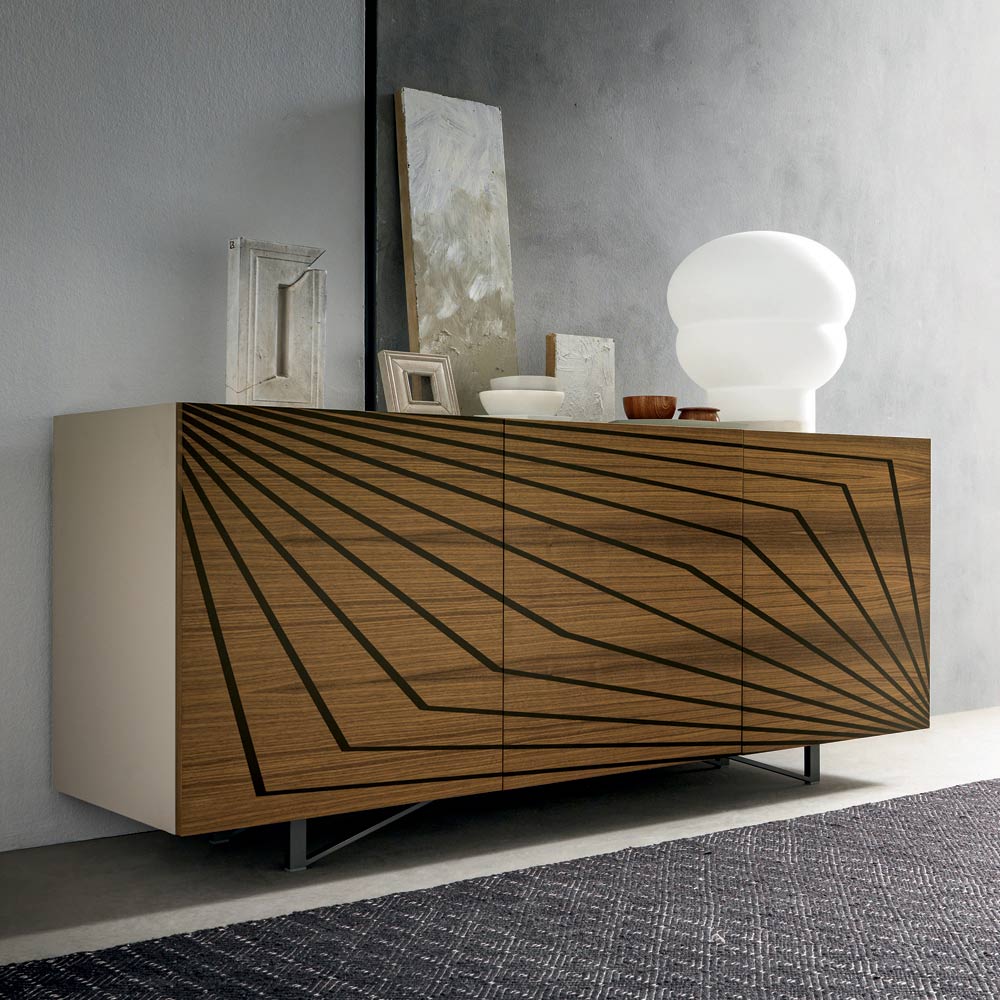 Dieses Sideboard für das Wohnzimmer hat eine Struktur komplett aus lackiertem MDF mit 3 furnierten Türenmit Siebdruck-Intarsien und 3 Innenregalen aus transparentem Hartglas . Die Besonderheit dieses Einrichtungsgegenstands liegt in den Linien, die an den Außenseiten zusammenlaufen und so einen exklusiven optischen Effekt erzeugen, für ein Design, das sich wie ein abstraktes Gemälde mit hohem Charakter präsentiert.