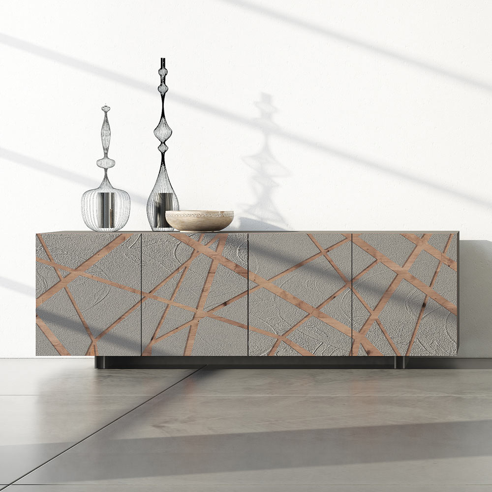 Wohnzimmer-Sideboard mit schlammfarben matt lackierterMDF- Struktur. Das Öffnungssystem hat 4koplanare Schiebetüren und amortisiert sich beim Öffnen und Schließen, um perfekte Funktionalität und Praktikabilität zu gewährleisten. Die Innenregale sind abnehmbar und aus 8 mm dickem Glas und enthalten auch einen Sockel . Dieses Produkt ist voller Geschmack und Design dank der Vereinigung verschiedener Materialien, seiner eleganten und raffinierten Oberflächen und verschönert durch die Dekoration an der Tür mit Eichenflachrelief . Alle für die Konstruktion verwendeten Materialien bieten eine hohe Qualität und Beständigkeit im Laufe der Zeit und verleihen dem Produkt eine einzigartige und unvergessliche Note.