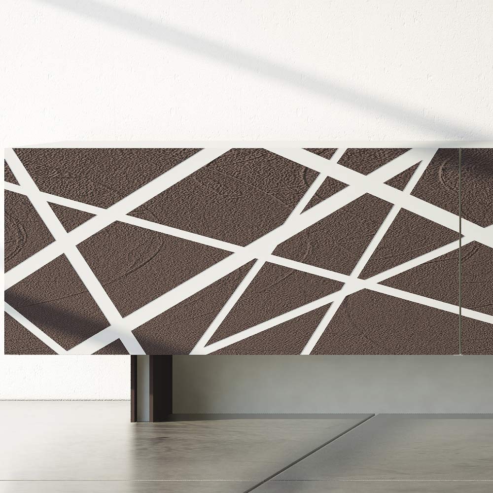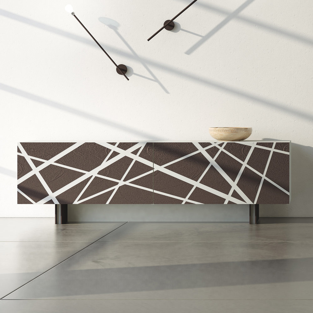 Wohnzimmer-Sideboard mit MDF-Struktur in Melamin Clay innen und matt lackiertem Vulkanbraun außen. Das Öffnungssystem hat 2koplanare Schiebetüren und amortisiert sich beim Öffnen und Schließen, um perfekte Funktionalität und Praktikabilität zu gewährleisten. Die Innenregale sind abnehmbar und aus 8 mm dickem Glas, während die Füße aus Metall sind. Dieses Produkt ist voller Geschmack und Design dank der Vereinigung verschiedener Materialien, seiner eleganten und raffinierten Oberflächen und der Verzierung der Tür mit weißem Flachrelief. Alle für die Konstruktion verwendeten Materialien bieten eine hohe Qualität und Beständigkeit im Laufe der Zeit und verleihen dem Produkt eine einzigartige und unvergessliche Note.