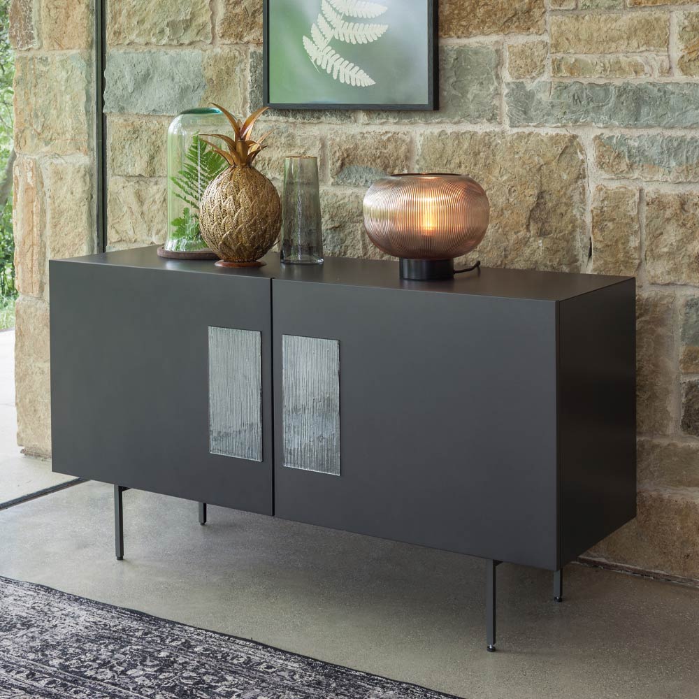 Wohnzimmer-Sideboard aus anthrazitmetallic lackierter Spanplatte , Türen mit farblich abgestimmten Glaseinsätzen in derselben Farbe, 2 Innenregale und Metallfüße , komplett Made in Italy. Es besticht durch seine Schlichtheit, durch sein klares und geradliniges Design, das selbst die Aufmerksamkeit der anspruchsvollsten Betrachter auf sich zieht. Das Sideboard weist wertvolle Details auf, wie die Glaseinsätze an den lackierten Türen, die einen Hauch von Eleganz und Raffinesse verleihen. Dieses Sideboard bietet eine stilvolle und funktionale Aufbewahrungslösung mit internen Regalen, die Platz zum Ordnen persönlicher Gegenstände oder Haushaltsgegenstände bieten. Die Glaseinsätze bilden einen schönen Kontrast zur lackierten Oberfläche und machen dieses Möbelstück zu einer anspruchsvollen Wahl für jede moderne Umgebung.