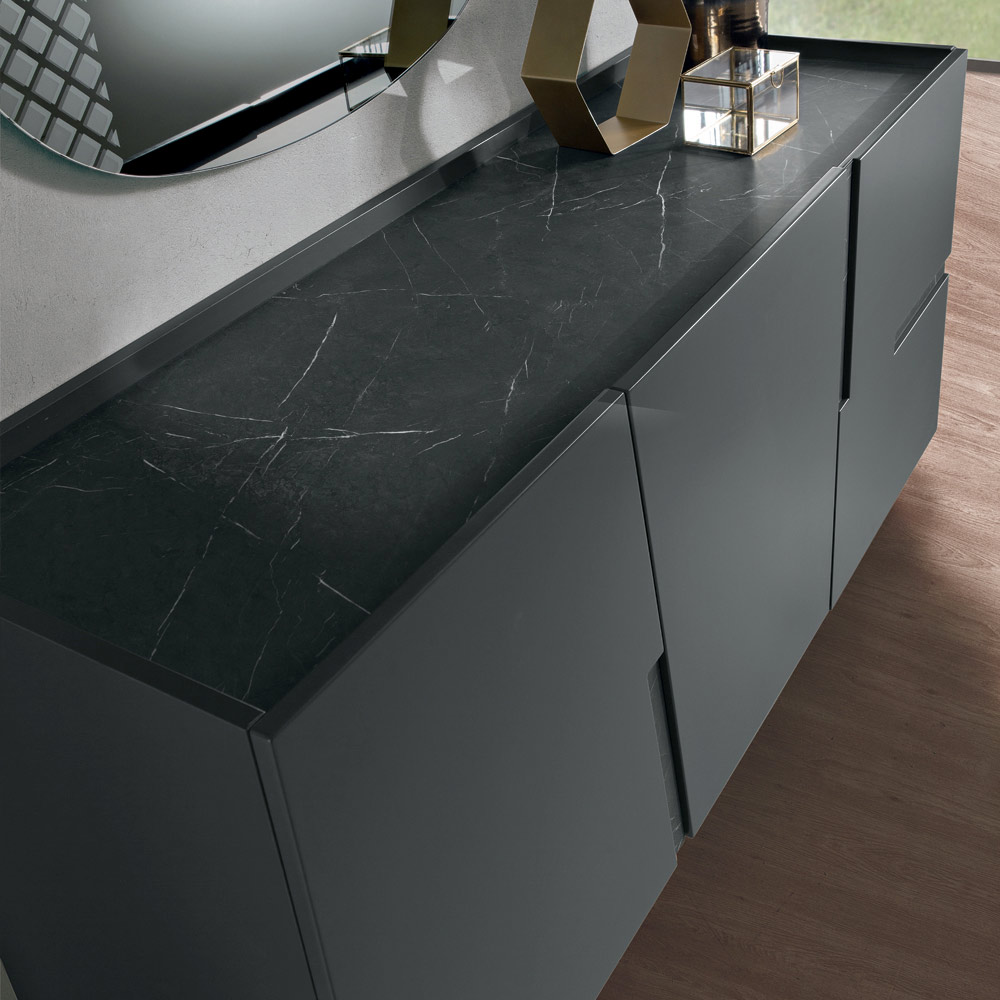 Die Konstruktion besteht aus einem Korpus aus Melamin und lackierten MDF-Türen , wodurch eine einheitliche und elegante Oberfläche entsteht. Dekorative Einsätze und kontrastierende Arbeitsplatten in Ausführungen wie Marmor- , Teak- oder Bronze-Spiegeloptik verleihen dem Möbelstück Tiefe und Charakter.