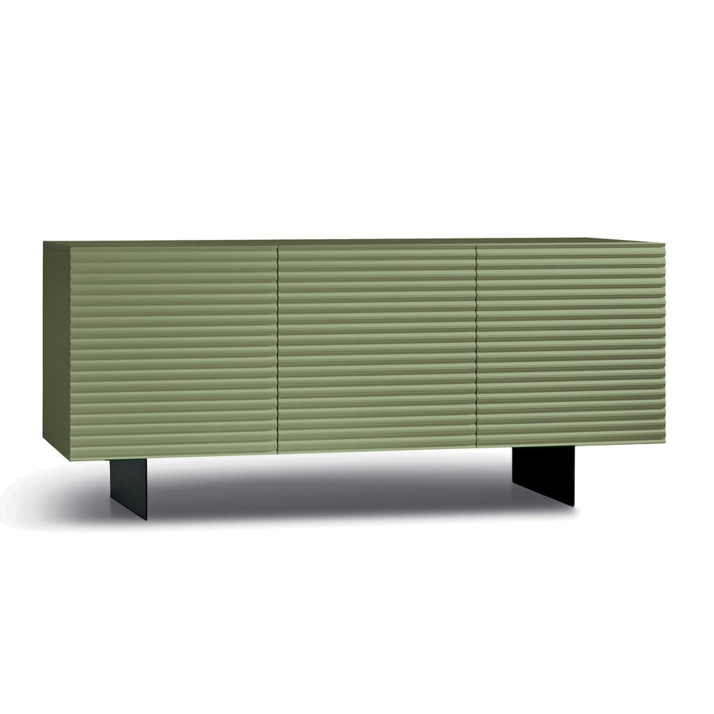 Die PVC-beschichteten MDF-Türen weisen ein erhabenes, horizontales Streifenmuster auf, das der Oberfläche Tiefe und Dynamik verleiht und einen eleganten grafischen Effekt erzeugt. Der dazu passende Korpus aus Melamin rundet das Design mit einem raffinierten Ton-in-Ton -Effekt ab und sorgt so für eine harmonische und moderne Komposition.