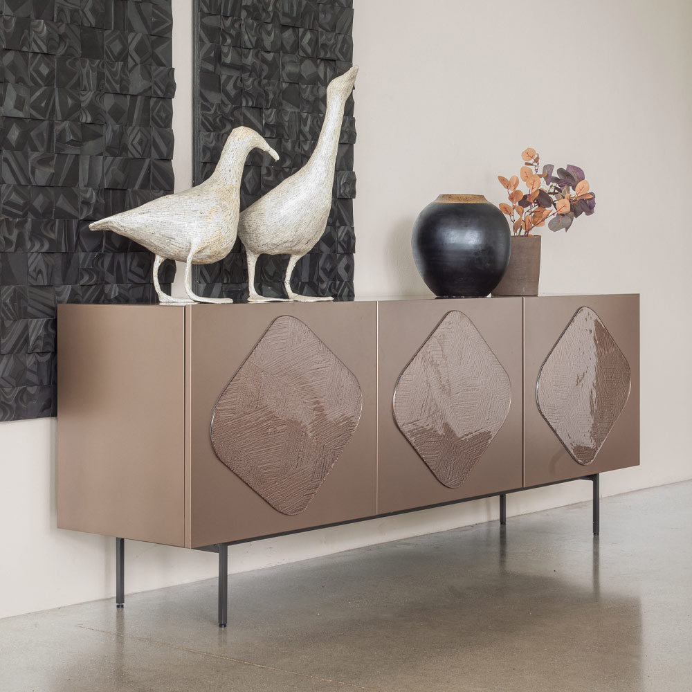Sideboard fürs Wohnzimmer aus Spanplatte in der Farbe Mokka metallic lackiert , Türen mit passenden Glaseinsätzen in der gleichen Farbe, 2 Innenregale und Metallfüße , komplett Made in Italy. Eine Verschmelzung von Eleganz und Funktionalität, die die Schönheit moderner Umgebungen hervorhebt. Es zeichnet sich durch seine hochwertige Lackierung aus, die eine glatte Oberfläche und ein glänzendes Erscheinungsbild bietet, das das Auge anzieht. Die Wahl des Lacks ist nicht nur ästhetisch, sondern auch praktisch, da er einen dauerhaften Schutz gegen tägliche Abnutzung bietet und das Sideboard im Laufe der Zeit schön hält. Das Design wird durch die dünnen Metallfüße, auf denen das Sideboard ruht, noch weiter aufgewertet. Diese Füße heben das Sideboard vom Boden ab und verleihen dem gesamten Möbelstück ein Gefühl von Leichtigkeit und Luftigkeit. Der Effekt der Leichtigkeit wird durch den glänzenden Einsatz betont, der die Türen kennzeichnet, ein Detail, das dem Design einen Hauch von Raffinesse und Modernität verleiht.