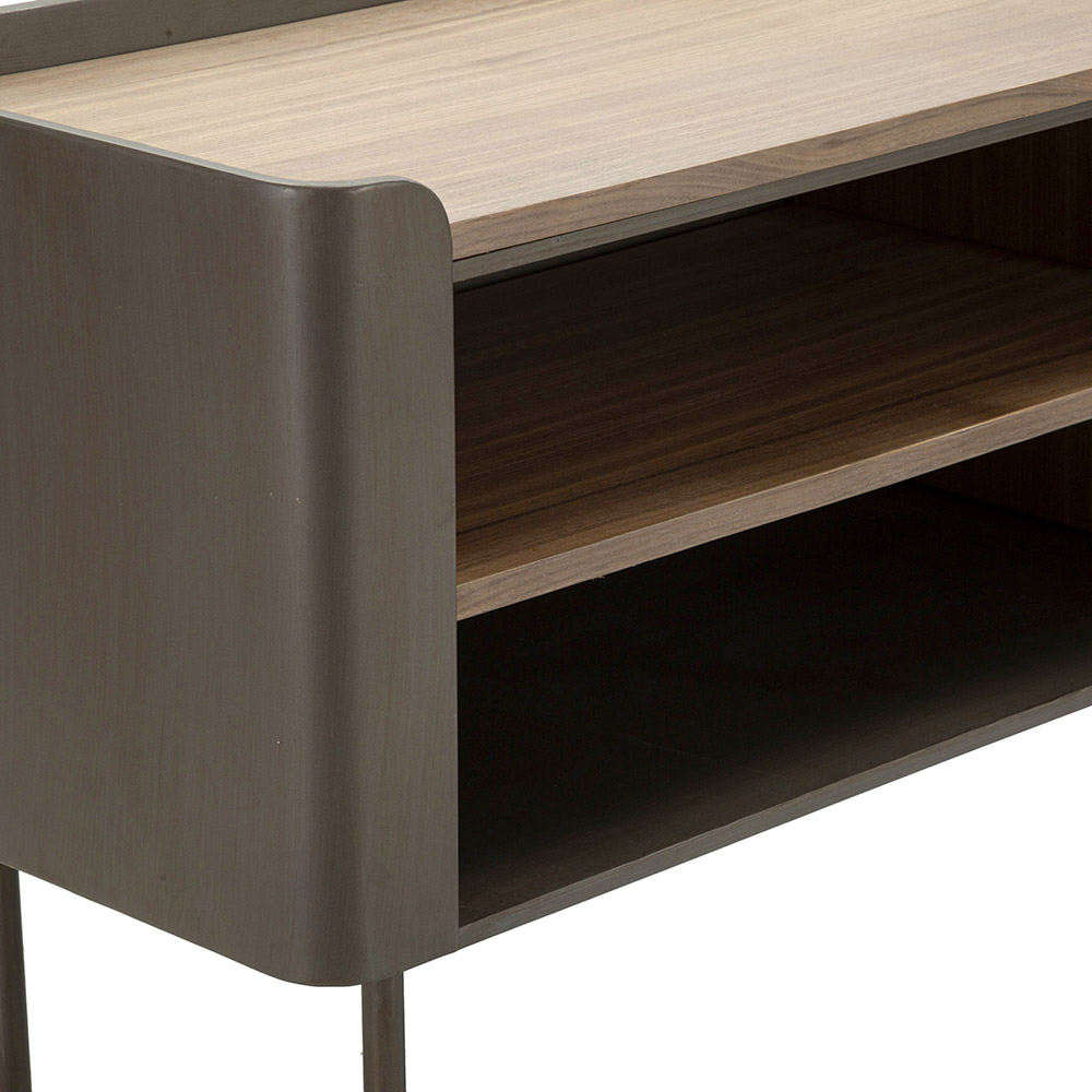 Dieser TV-Ständer aus Holz und Eisen ist die Quintessenz funktionaler Eleganz und raffinierten Designs. Mit seinen klaren Linien und seinem minimalistischen Stil passt er diskret in jede Umgebung und bietet dank seiner praktischen und leicht zu handhabenden Schubladen eine große Oberfläche und nützlichen Platz zum Aufbewahren kleiner Gegenstände. Das dunkle Holzfinish verleiht ein Gefühl von Wärme und Reichtum , während die robuste Konstruktion für Haltbarkeit und Stabilität sorgt.