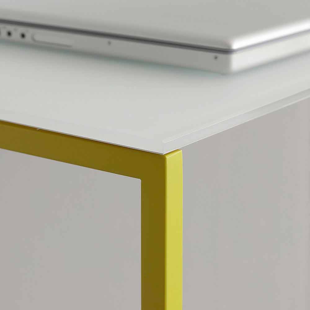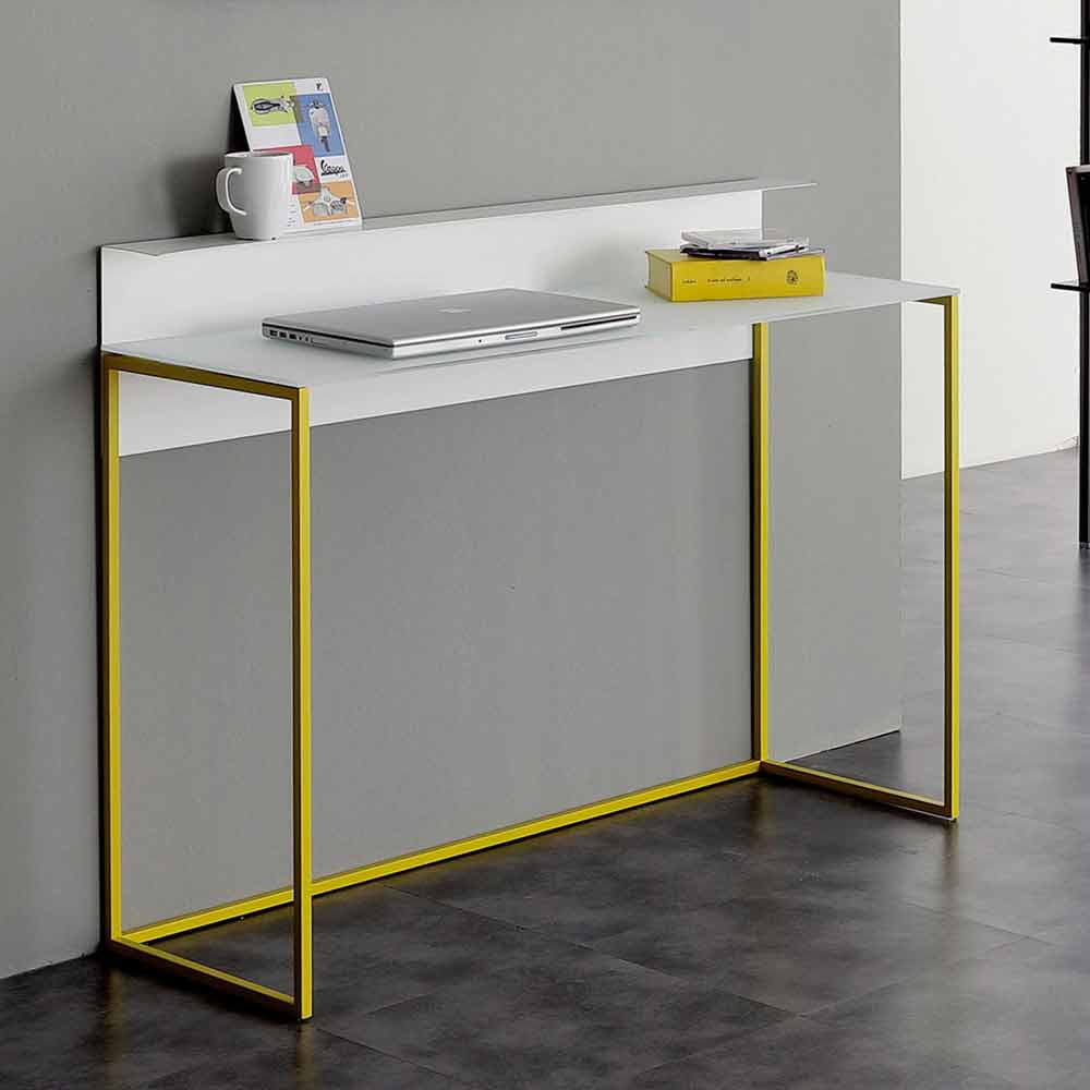 Wohnzimmerkonsole made in Italy mit glänzender weißer Glasplatte mit weißem Backsplash und gelb lackierter Metallstruktur . Einfache und essentielle Linien erwecken ein Möbelstück mit einer nüchternen und vielseitigen Ästhetik zum Leben, ideal, um den Stil Ihrer Zimmer mit einem Hauch kreativer und avantgardistischer Farben zu revolutionieren. Die Möglichkeit, zwischen 3 verschiedenen Größen zu wählen, ermöglicht es der Konsole, alle Anforderungen zu erfüllen, sodass Sie dank der besonders schmalen Oberseite, die eine ideale Auflagefläche für den Eingang oder das Wohnzimmer darstellt, diese jedoch perfekt macht, auch kleinste Räume stilvoll einrichten können Ergänzung auch als praktischer Schreibtisch zu verwenden. Die exzentrische und lebendige Farbe, die die gesamte Basis charakterisiert, verleiht dem Produkt seine frische und innovative Persönlichkeit und schafft eine perfekte Kombination mit dem eleganten Element des Kristalls.