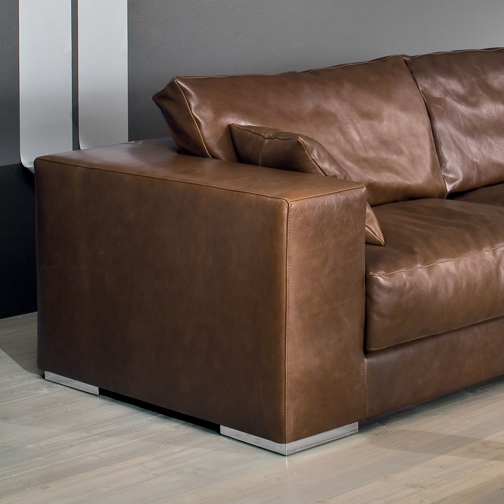 verchromtem Metall. Das Sofa drückt eine moderne und funktionale Ästhetik aus. Seine robuste Struktur ist mit großen und einladenden Kissen verziert, die Komfort garantieren. Die hochwertige Polsterung, die in verschiedenen Farbtönen erhältlich ist, passt elegant zu verschiedenen Einrichtungsstilen. Das geradlinige Design und die Metallfüße betonen die Modernität des Stücks und machen es ideal sowohl für Wohnräume als auch für Vertragsumgebungen wie Büros oder Wartezimmer.