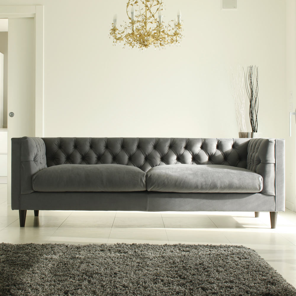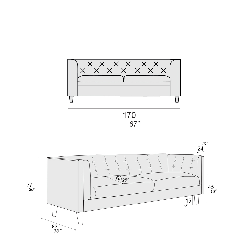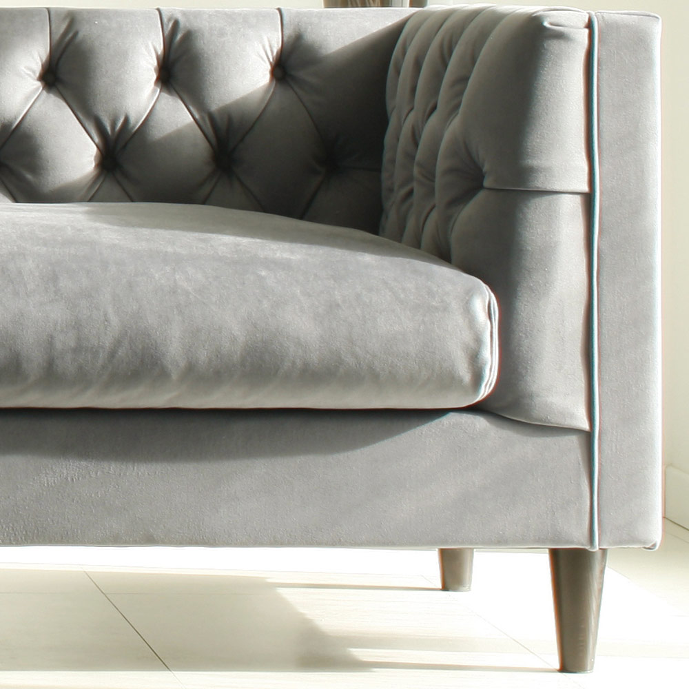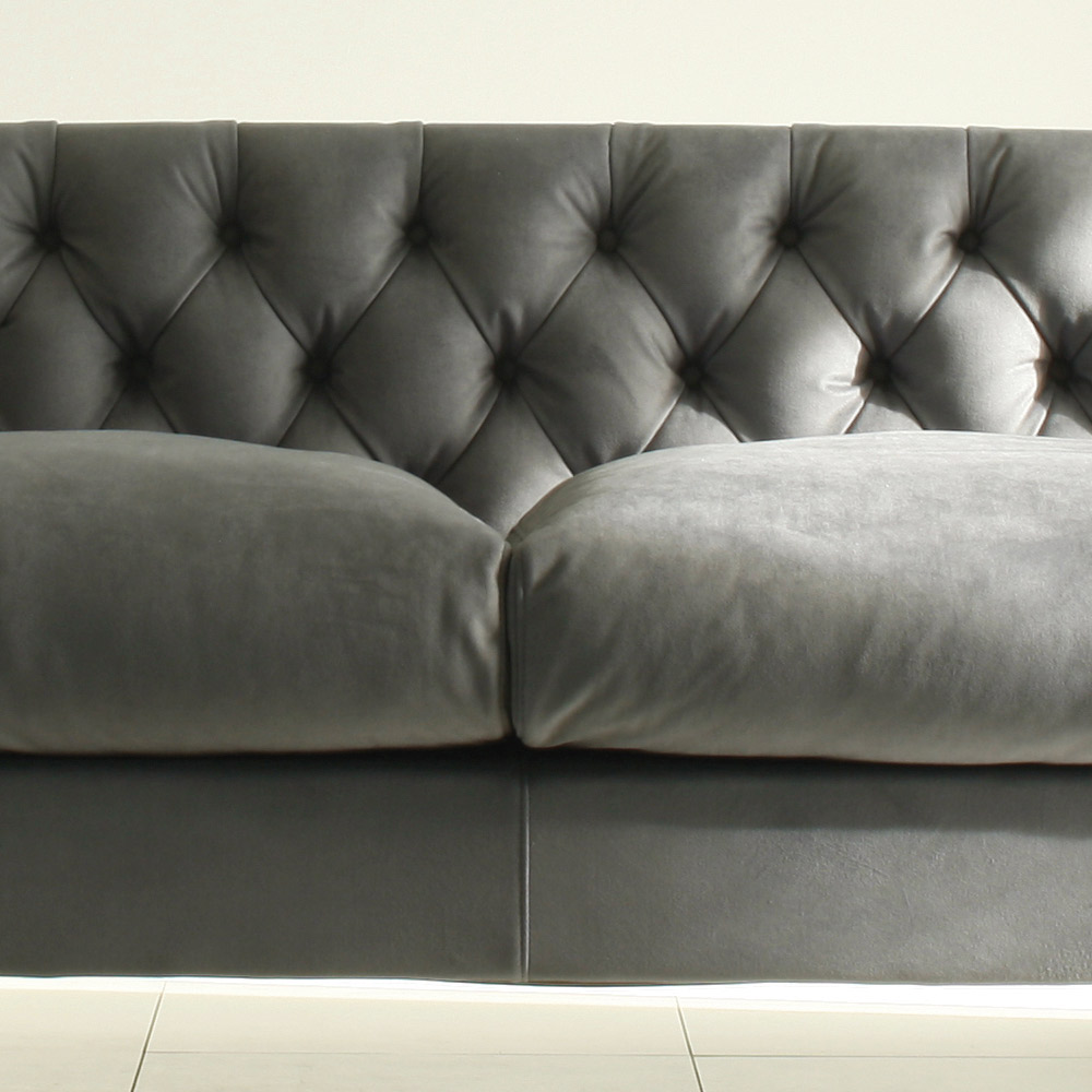 Wohnzimmersofa mit einer Struktur aus Massivholz, Sperrholz, Holzkonglomerat und Füllung aus Rohholzfaserplatten . Die Polsterung der Struktur selbst besteht aus Polyurethanschaum D.40aus Polyesterfaser . Federn mit elastischen Gurten mit kontrollierter Elastizität sind in einem gekreuzten System montiert. Das Sitzkissen besteht aus hochdichtem Polyurethanschaum , gepolstert mit Federn und Polyesterfasern. Die Füße sind aus Buchenholz. Das Sofa verbindet Klassik mit einem modernen und raffinierten Look. Seine geknöpfte Polsterung und die abgerundeten Armlehnen strahlen Eleganz aus, während der Holzrahmen und die großzügige Polsterung für Komfort sorgen. Die hochwertige Polsterung, die in verschiedenen Farben erhältlich ist, bereichert das Aussehen des Sofas. Die dünnen Holzbeine verleihen einen zeitgenössischen Touch, wodurch das Sofa sowohl für traditionelle als auch für moderne Innenräume geeignet ist und ihm eine gemütliche und anspruchsvolle Atmosphäre verleiht.