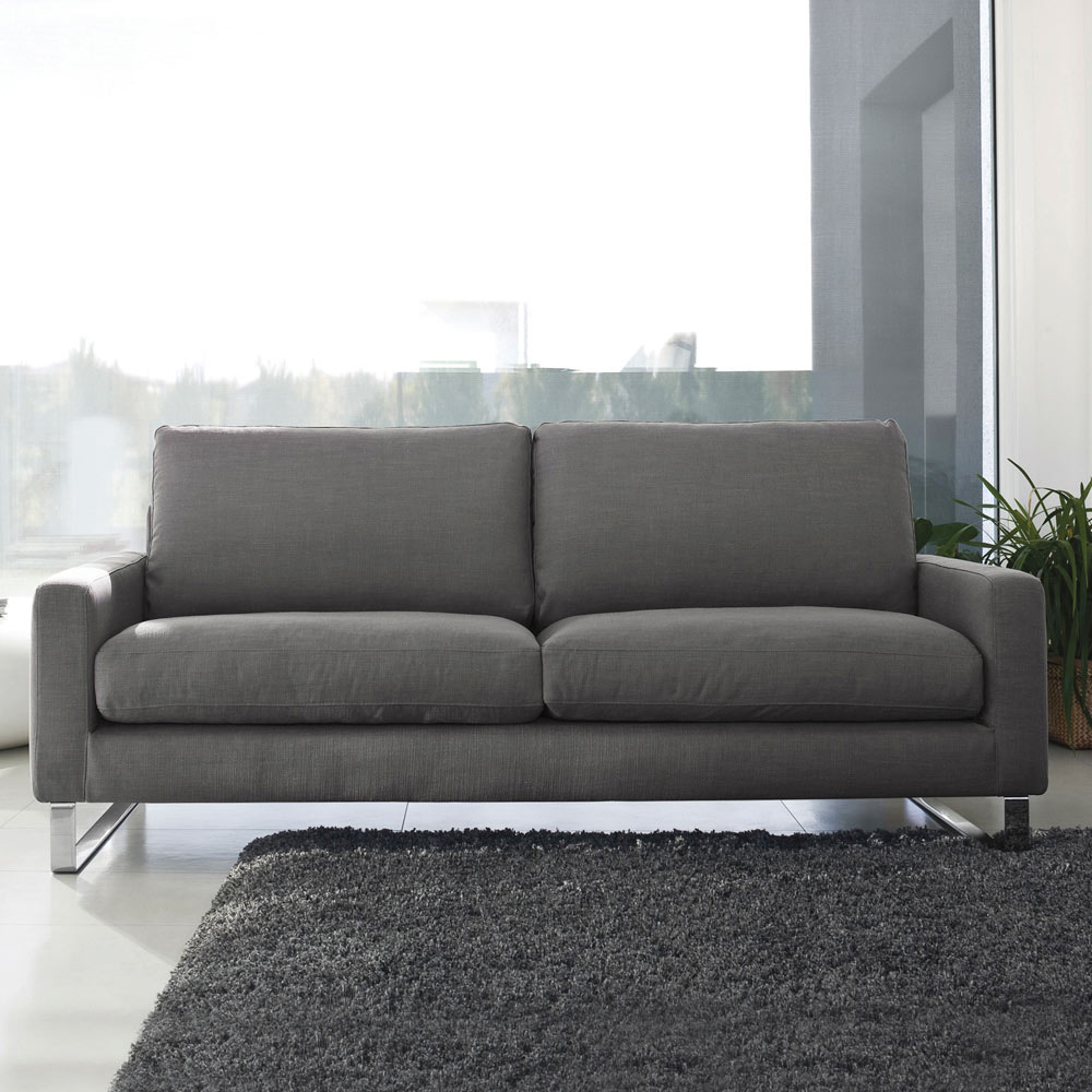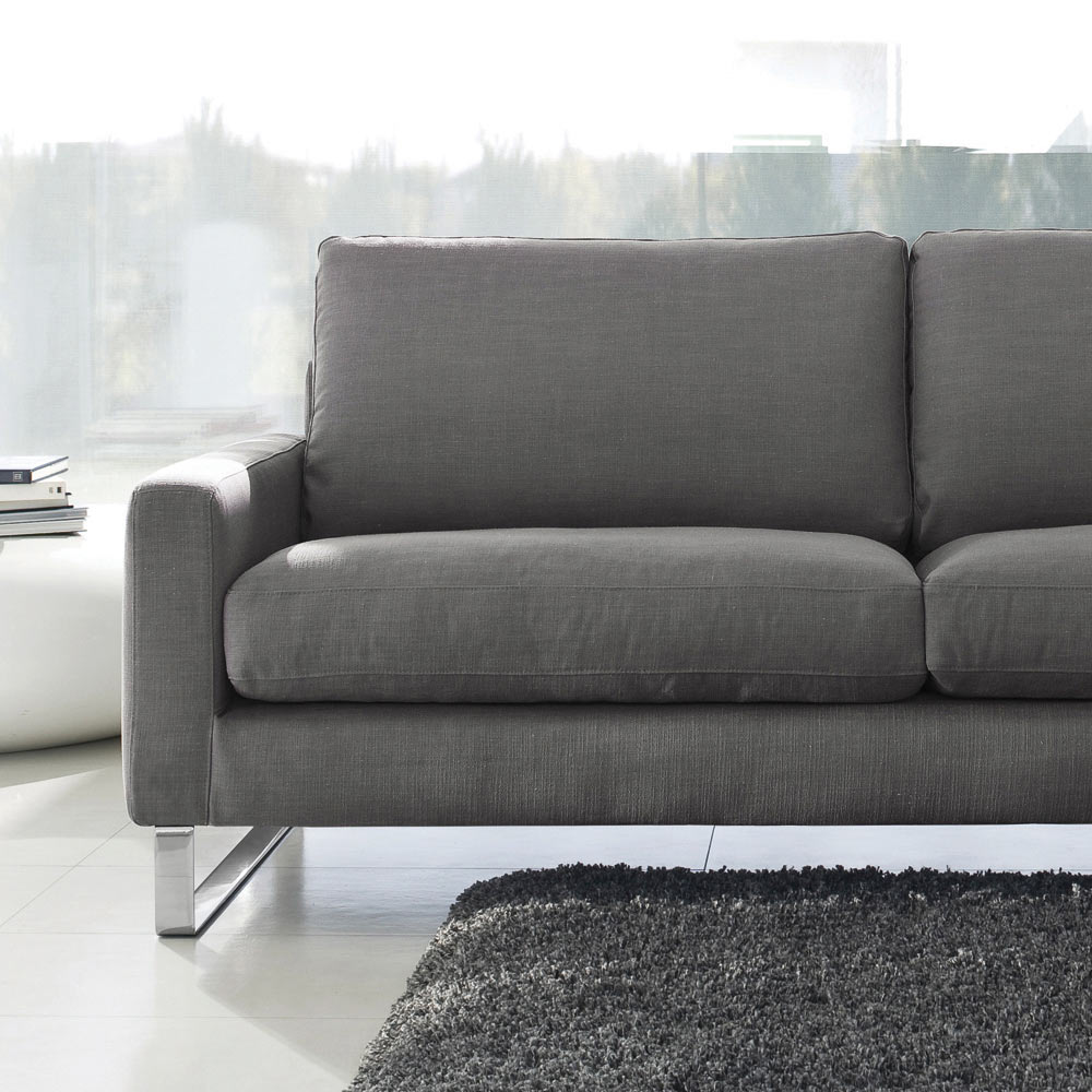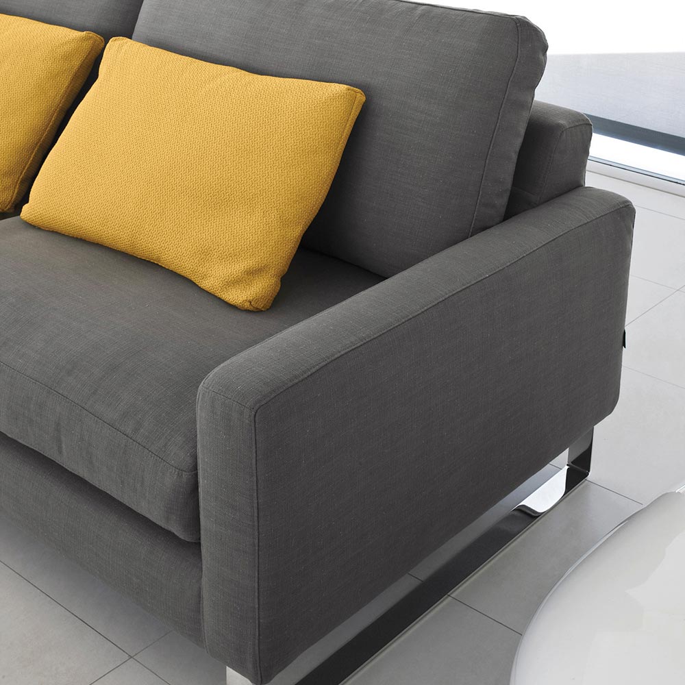 Wohnzimmersofa mit einer Struktur aus Massivholz, Sperrholz, Holzkonglomerat und Füllung aus Rohholzfaserplatten . Die Polsterung der Struktur selbst besteht aus Polyurethanschaum D.40 und Polyesterfaser . Federn mit elastischen Gurten mit kontrollierter Elastizität sind in einem gekreuzten System montiert. Das Sitzkissen besteht aus hochdichtem Polyurethanschaum und ist mit Federn und Polyesterfasern gepolstert. Das Rückenkissen besteht aus Federn und Polyesterfasern, die in einem federdichten Canvasbeutel mit verschiedenen Fächern gesammelt sind. Die Füße bestehen aus verchromten Metallschlitten. Das Sofa verkörpert die Essenz des in Funktionalität umgesetzten Minimalismus. Mit seinem einzigartigen Design bietet es Komfort und Eleganz und verspricht, in Bezug auf Ästhetik und Komfort immer mit der Zeit zu gehen. Die große Auswahl an Polsterungen und Farben macht es zu einem vielseitigen Möbelstück für jede Umgebung.