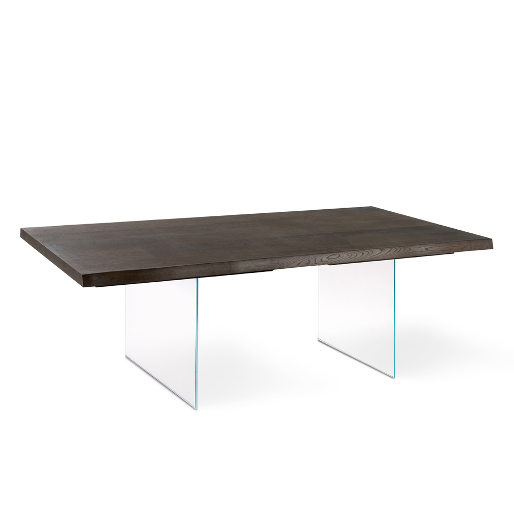 Fester Wohnzimmertisch mit Eichenfurnierplatte und extra transparenten Beinen aus gehärtetem Glas.