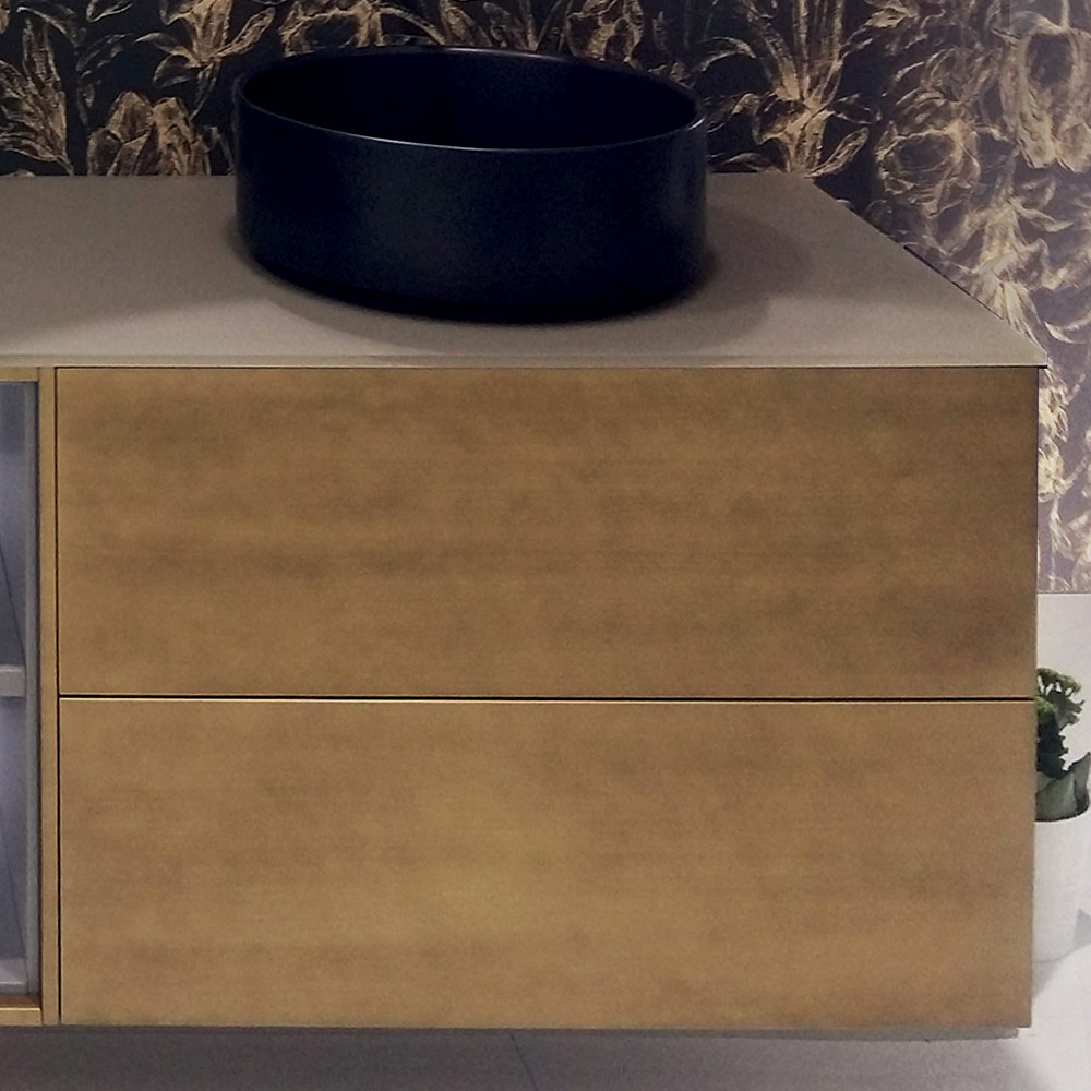 Diese Badmöbel Kombination beinhaltet einen Doppel - Waschtisch mit Schubladen mit praktischen Push & Pull - Öffnungssystem in Bronze lackiertes MDF   matt antikisierte und doppelte Aufsatzwaschtische aus anthrazitgrauem Stonelight-Harz. Diese ruhen auf einer satinierten, erdfarbenen Glasplatte und einem Sockel mit einem offenen Fach in der Mitte zweifarbig in antik Bronze und rauchgrau lackiert.