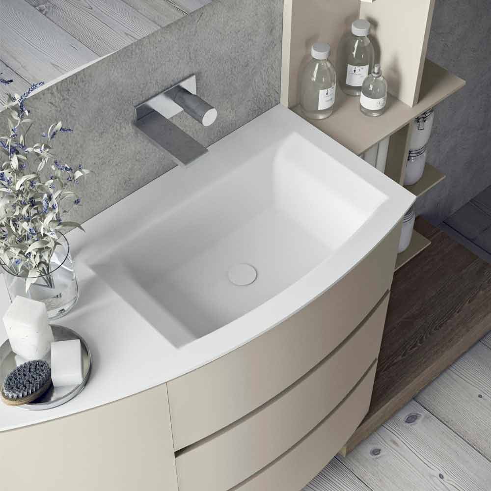 Badmöbel mit geschwungenen Fronten aus mattem Sandlack, integriertem Waschbecken aus mattweißem Teknorit , hinterleuchtetem Spiegel, offenem Element aus mattem Sandlack, dicker Bank H 10 aus einfarbiger Tabakeiche HPL.