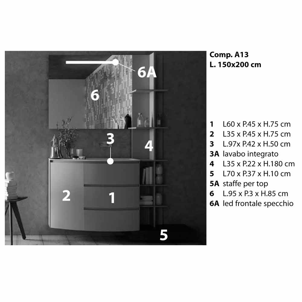Moderne hängende Badezimmerkomposition, geschwungenes und regelmäßiges Design mit offenen Regalen, hergestellt in Italien.