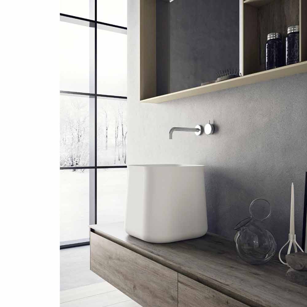 Die Besonderheit dieser Zusammensetzung ist die Silhouette des hohen Waschbeckens auf der Arbeitsplatte, die sich durch die nach außen öffnende Kante auszeichnet, die an die Form einer Tulpe erinnert, im Gegensatz zur Linearität der darunter liegenden Fächer, wodurch die Formen gemildert werden.