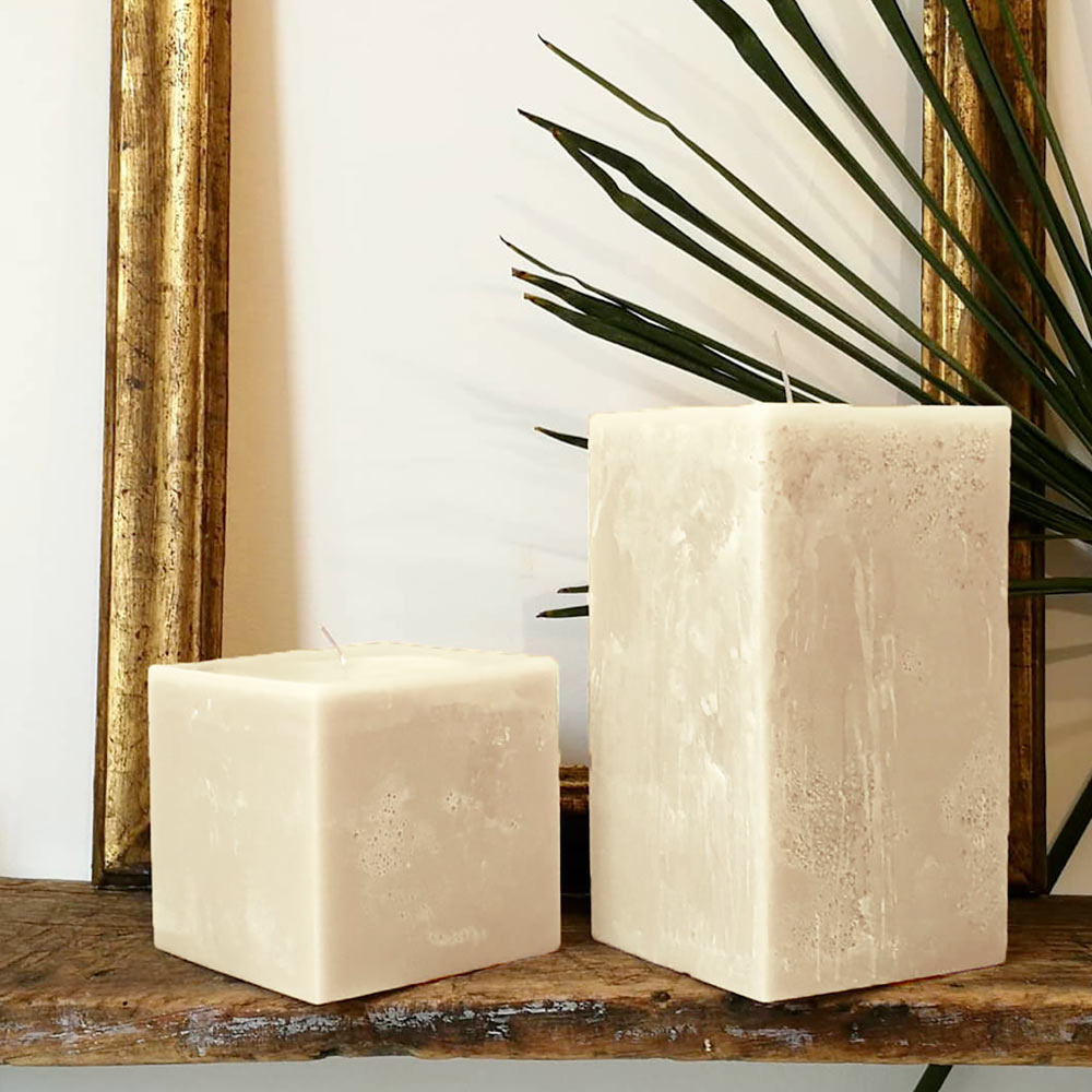 Zusammensetzung von 3 quadratischen Kerzen in verschiedenen Größen und in verschiedenen Farben aus Made in Italy Wachs erhältlich.