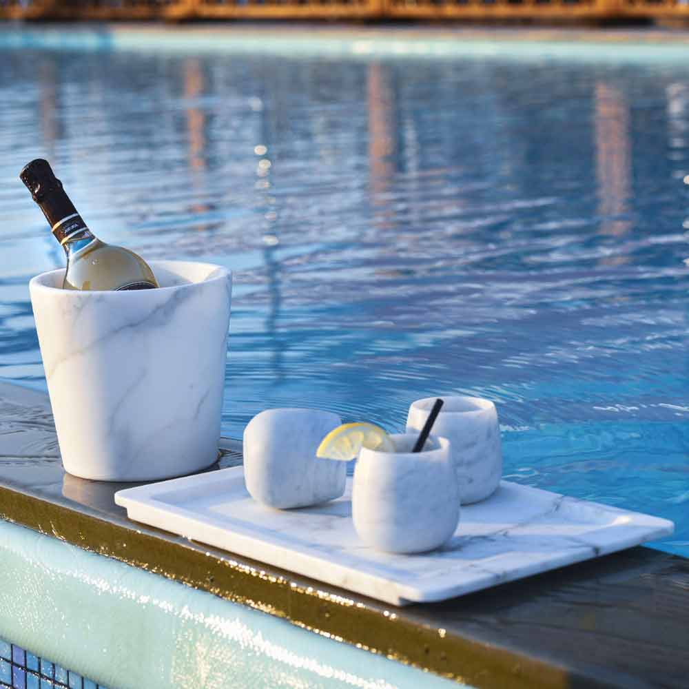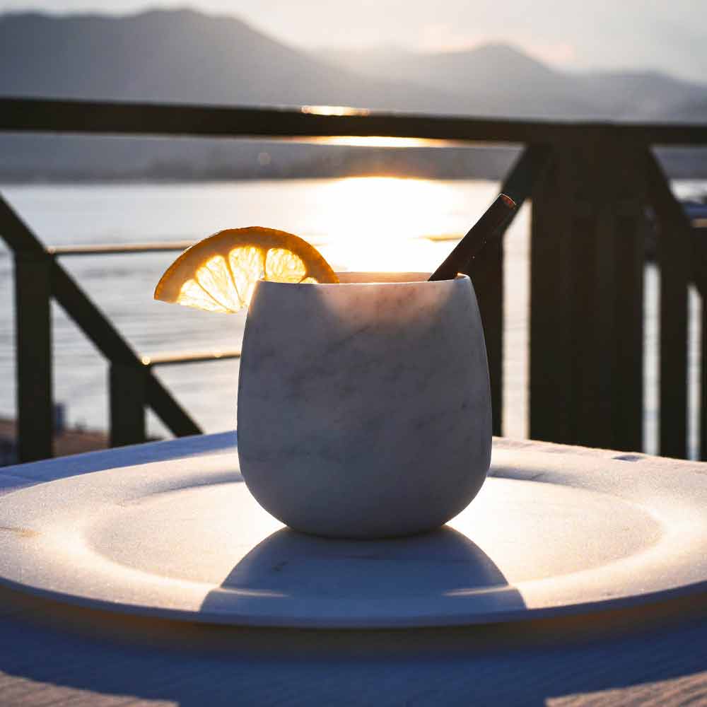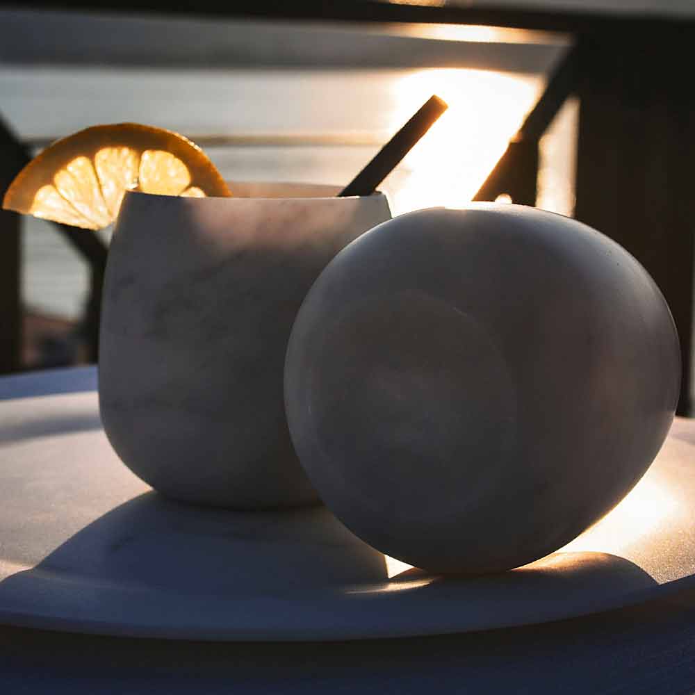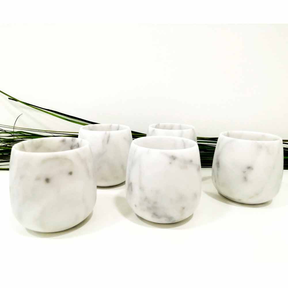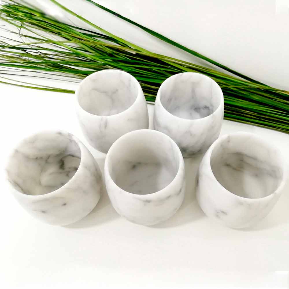 NB : Aufgrund der charakteristischen Porosität von Marmor wird nicht empfohlen, farbige Getränke in diese zu gießen, um den natürlichen weißen Farbton des Marmors bestmöglich zu erhalten.