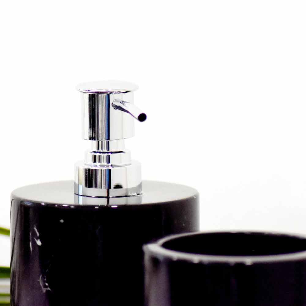 Zusammensetzung von 3 Badzubehörteilen : Zahnbürstenhalter, Flüssigseifenspender und Seifenschale. Diese 3 in Italien handgefertigten Artikel sind in weißem Statuario-Marmor oder schwarzem Marquinia-Marmor erhältlich , einem sehr kompakten Material mit einem intensiven schwarzen Hintergrund mit weißen oder hellgrauen Adern. Beide Varianten tragen zur Schaffung eines Badezimmerbereichs mit einer raffinierten und modernen Atmosphäre bei. Die Kombination von Materialien, Oberflächen und Techniken, die zusammen mit der Arbeit der Meister verwendet werden, ermöglicht es, ein qualitativ hochwertiges Endprodukt mit Liebe zum Detail zu erhalten, das sich perfekt zum Dekorieren eignet Umgebungen mit zeitgemäßem Geschmack.